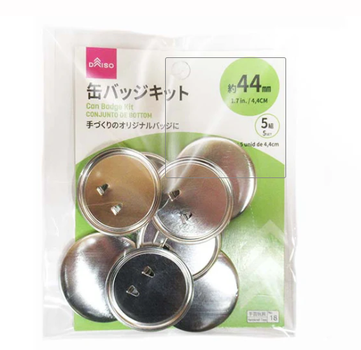 100均は缶バッジキット初心者にとって、まさに救世主的な存在です。ダイソーでは25mmと32mmの2サイズを展開していて、どちらも税込み110円という手頃な価格で購入できます。