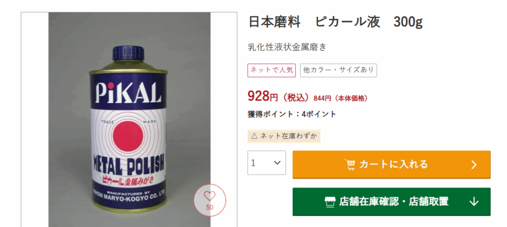 ドンキは洗剤や掃除用品も豊富なんですが、ピカールのような専門的な金属磨きは扱っていないみたいですね。深夜に急に必要になっても、ドンキでは買えないので別の店舗を探しましょう。