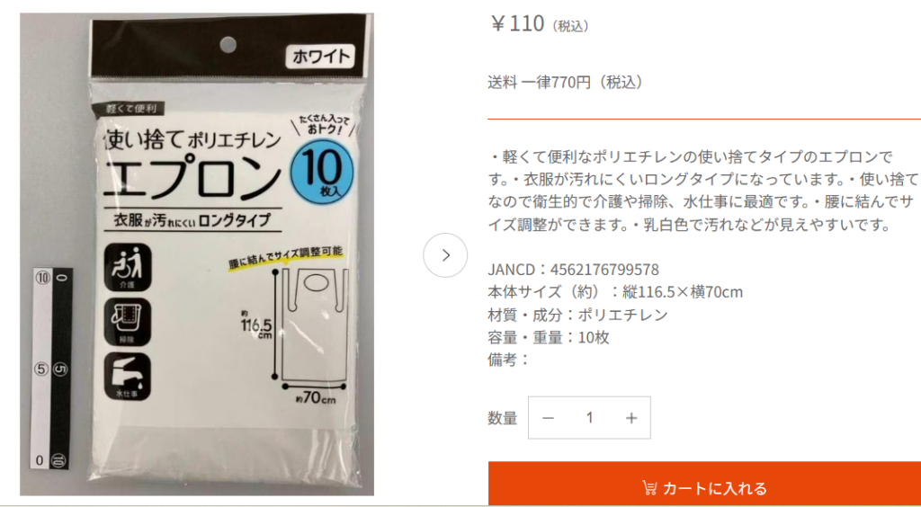 ただし、メインで取り扱っているのはポリエチレン製の使い捨てエプロンが多いため、不織布タイプの紙エプロンを探している方は事前に店舗に確認すると良いでしょう。