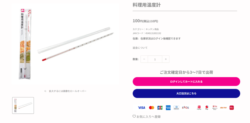 初めて料理用温度計を使う方や、お試しで購入してみたい方には最適な価格ですね。店舗によって在庫状況が異なる場合があるため、確実に購入したい方は事前に店舗に確認すると安心です。