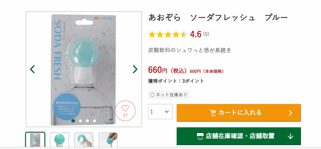 キッチン用品や便利グッズを置いている店舗もありますが、炭酸キーパーは見つかりにくいです。