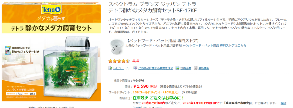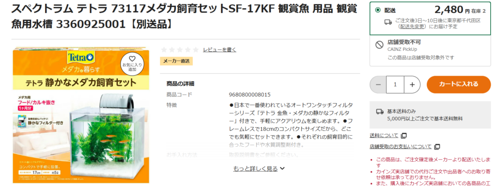 ビックカメラにもメダカ用の水槽があります。家電量販店ですが、ペット用品コーナーも意外と充実しているんですよ。ネットで在庫を確認してから店舗に行けるので、無駄足を防げます。
