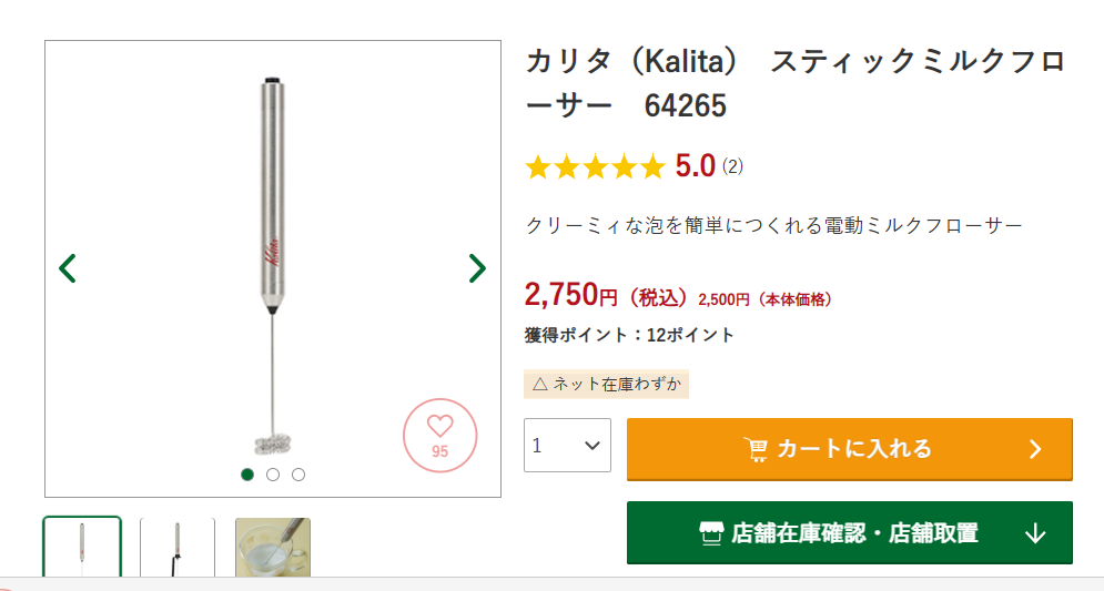 ビックカメラにもミルクフォーマーが売っていました。ヨドバシに比べると少し安いものが見つかることもあります。ネットで在庫を確認してから店舗に行けるので、無駄足を防げますよ。