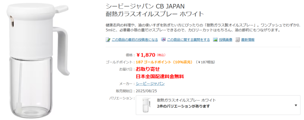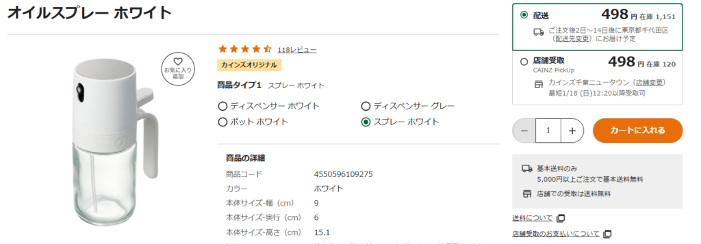 ヨドバシカメラにも、オイルスプレーが販売されています。家電量販店ですが、キッチン用品のコーナーも充実しているんですよ。