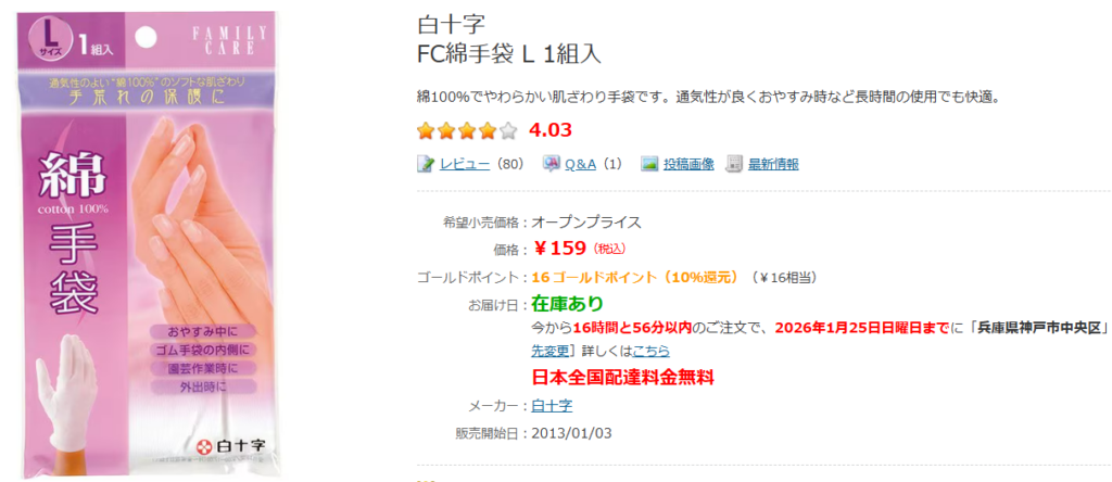 ヨドバシカメラのオンラインは全商品送料無料なので、白手袋だけを購入する場合でも追加費用がかかりません。