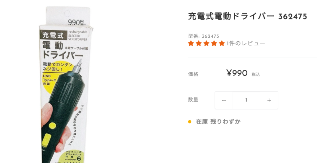 電動ドライバーは工具の一種なので、取り扱い店舗が限られているんです。特に日常的な雑貨や衣類を中心に扱う店舗では、電動工具のような専門的な商品は品揃えに含まれていないことがほとんど。