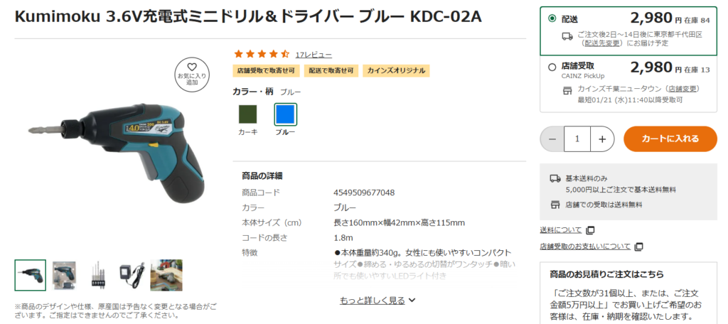 家電量販店のヨドバシカメラやビックカメラでも、電動ドライバーの取り扱いがあります。特にヨドバシカメラのオンラインストアは品揃えが豊富で、2,000円台から購入できる手頃なモデルも見つかります。