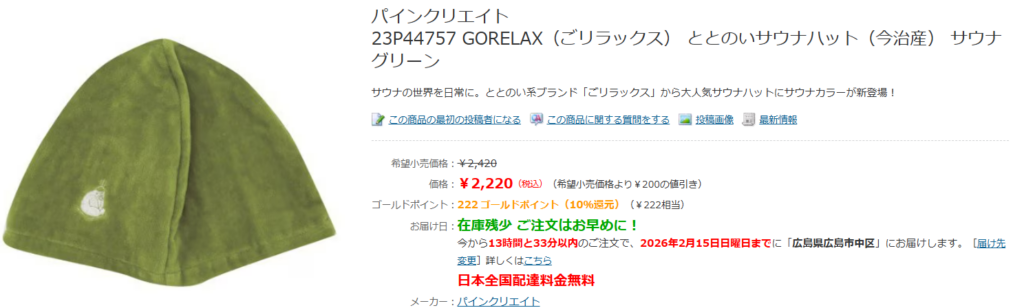 日用品や衣料品、食品などは充実していますが、サウナハットのような専門的なレジャー用品は見つかりにくいんです。