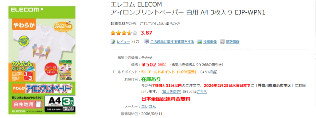 楽天市場にも、アイロンプリントシートが豊富に揃っています。お急ぎの方は、Amazonで購入すると早ければ翌日配送をしてくれるショップもあります。